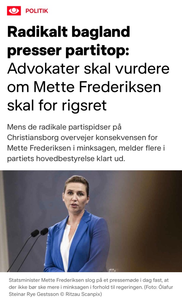 But what now? Well, that’s where the interesting concept of ‘Rigsret’, a sort of ‘Court of the Realm’, may come into play. If parliament at Christiansborg decides that there is basis for an independent legal review, Mette may end up facing a commission of (up to) 15 high court judges and an equal number of political appointees. That is the ‘Rigsret’. It determines whether or not a politician has broken the ‘ministerial responsibility law’.