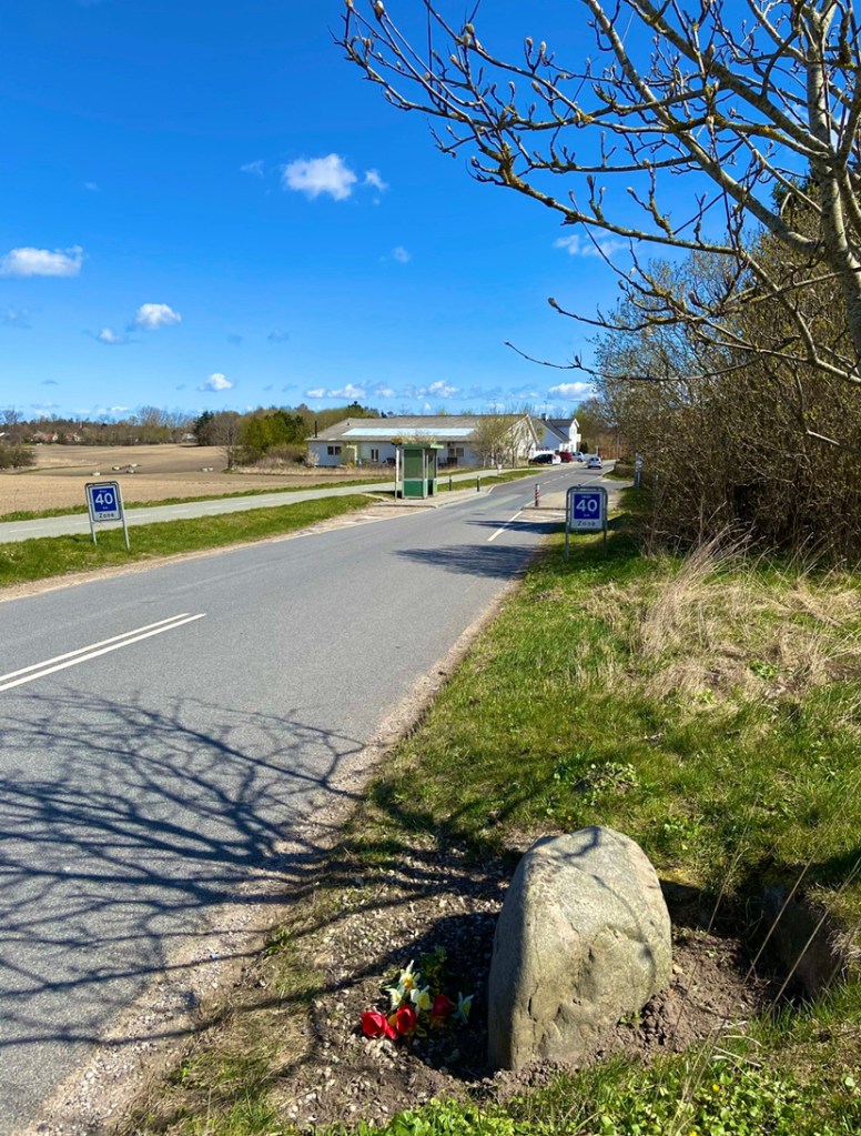 A similar floral tribute appears in Soeholm, which lies half way from here on the cycle path to the coastal town of Humlebaek. Each year, on the 23rd of April, a small bouquet of flowers appears next to a granite memorial stone. The stone lies discreetly by the roadside in the village, and is easily overlooked. Several years ago curiosity got the better of me. So I parked my bike and took a closer look. Checking the stone, it revealed an inscription about a 20-year-old man. It read: