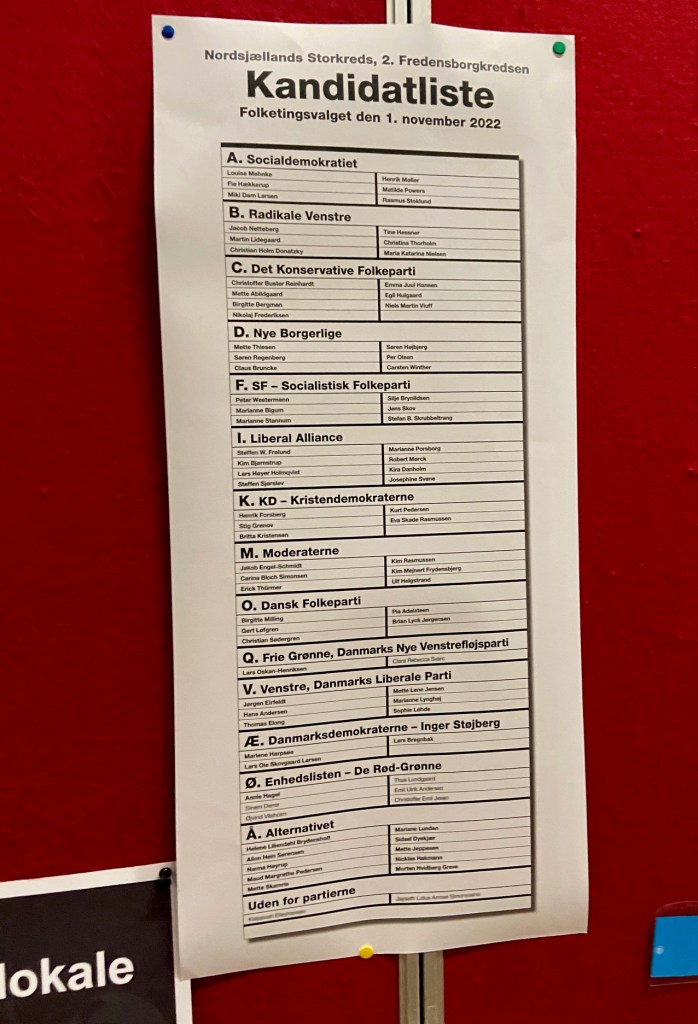 In the transformed sports hall, voting is straightforward. You turn up with your individual, barcode voting card that arrived by post. After you hand it over you’re asked for your date of birth, presumably as a security check. Only then are you given the long polling sheet. By the way, postal voting has seen an increase. In the Copenhagen region it hit 11%. This is put down partly to the council elections during Covid, where many chose to vote from home, and so, did again. But fewer polling stations than in previous times is also a factor. Remarkably, 11% is considered a high proportion in Denmark, though it comes nowhere near the exceptional 25% of postal votes cast during Indyref 2014.
