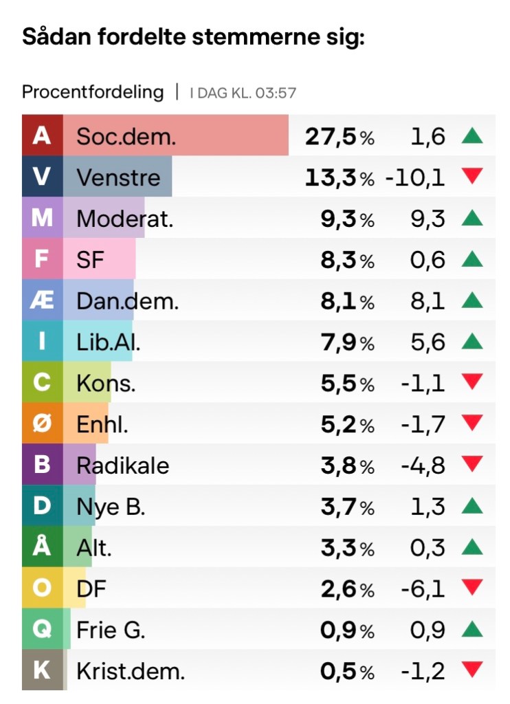 Between them, these two new parties have grabbed 30 of the 179 seats at Christiansborg with 9.3% and 8.1% of the vote, respectively. Just shows what can happen when you have a native-run domestic media, and no state censorship of new political parties seeking to bring fresh ideas and new impetus.