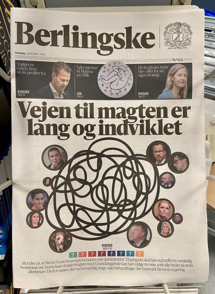As the front page headline of the broadsheet Berlingske reads: The road to power is long and complex. These negotiations could be over in a couple of days, or they could take three weeks as they did in 2019. Each support party will have its demands on policy decisions and commitments. It’s highly likely that a party from the blue block will have a place in the coalition, possibly the new centre party, Moderaterne, led by former PM Rasmussen.