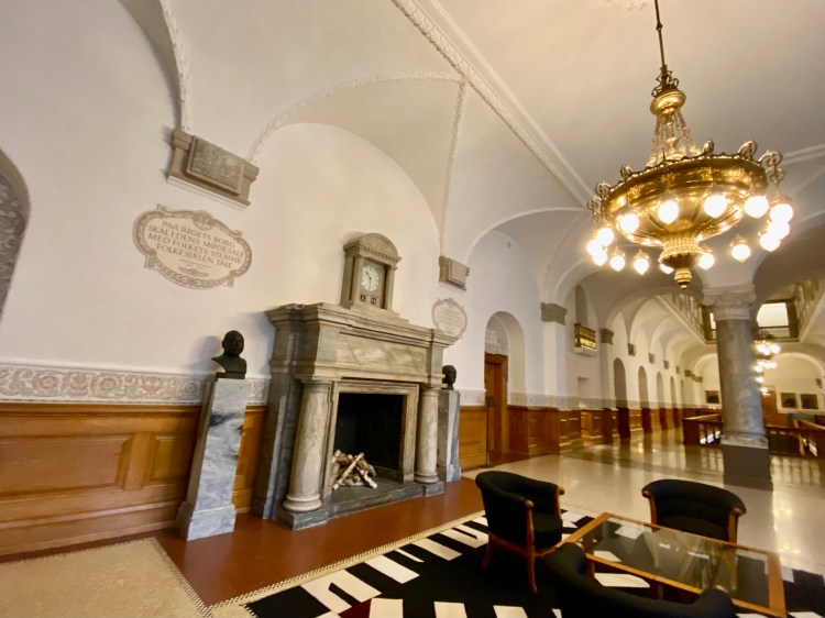 After the usual security checks, we head up a grand staircase. “The marble you see is from Greenland,” our guide declares, “and there’s basalt from the Faroe Islands, with granite from Bornholm.”