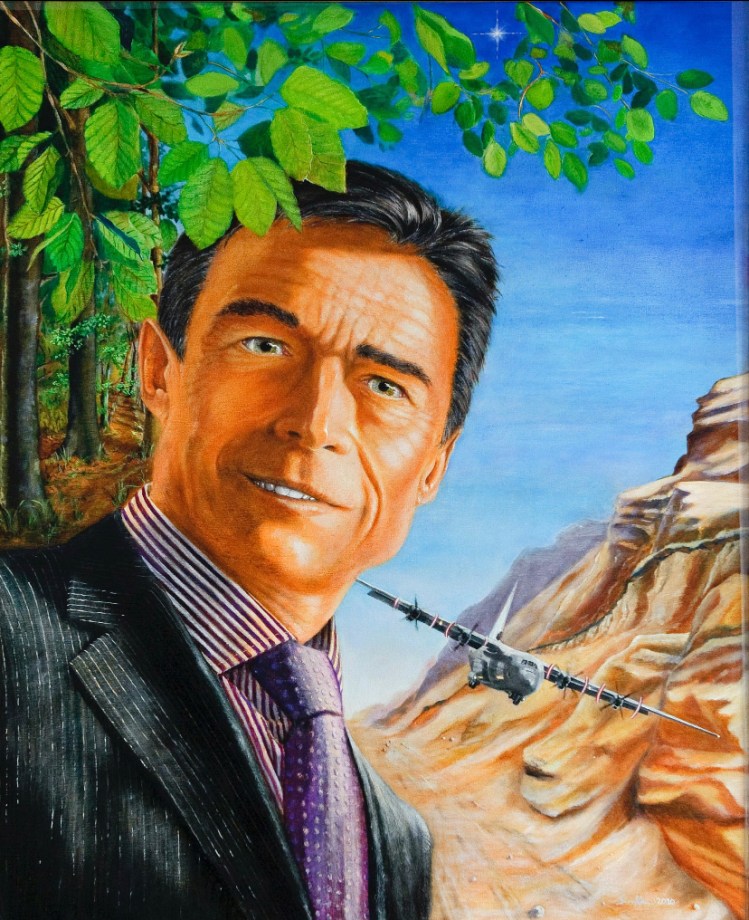 The result is probably the most controversial PM portrait of them all. In it, Rasmussen is staring at us. There’s a NATO star in the sky and a Hercules aircraft of the Danish Air Force.