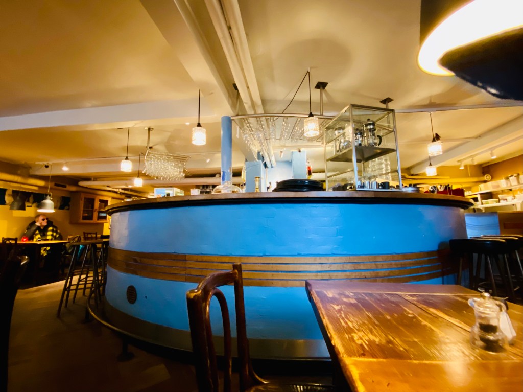 Tour over, we’re back outside again. The drizzle is more intense. I suggest we head for a cafe over on Gammel Strand by the Metro station. Neither of us managed breakfast before our early start.
