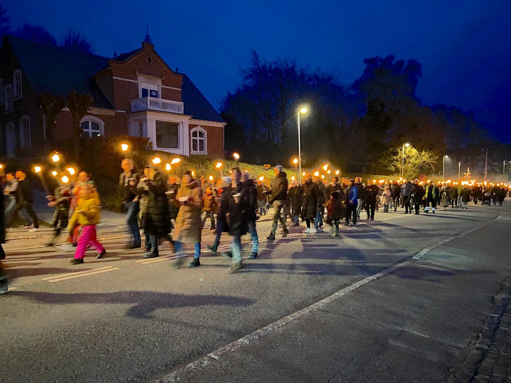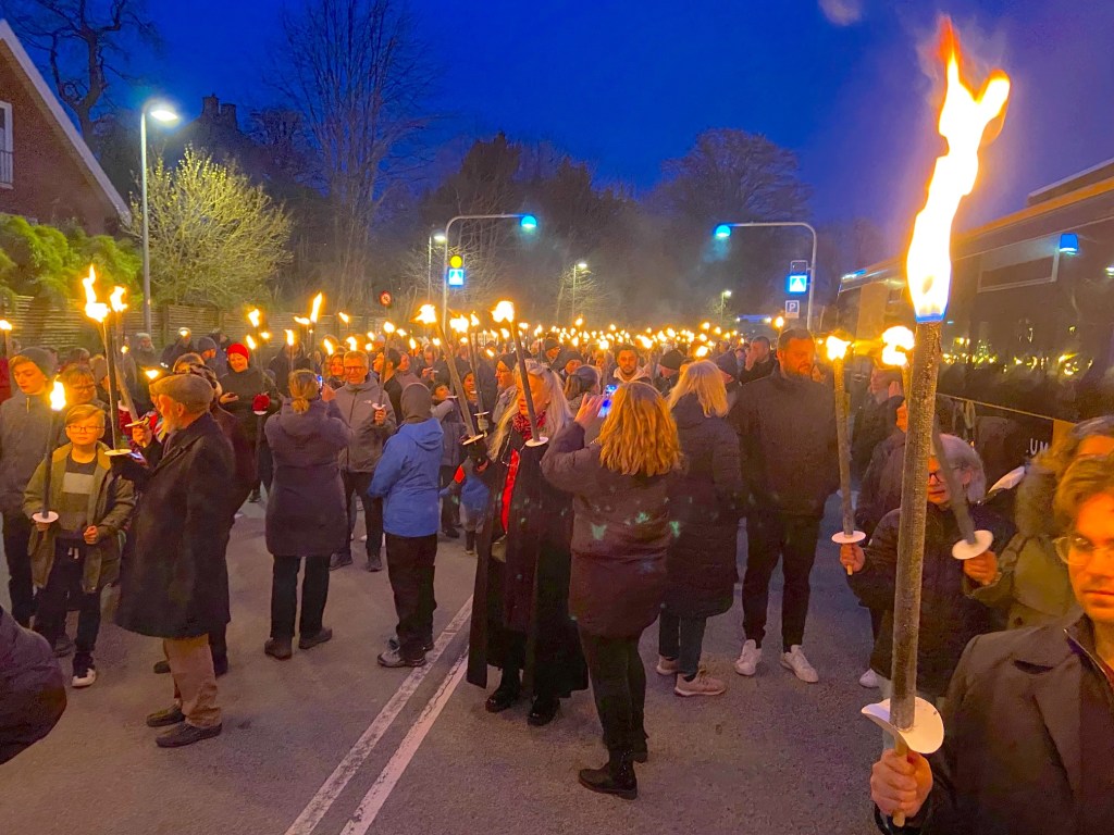 There’s a sea of flame gathering in the twilight. It started with only one torch, but each newly lit passes the flame to two or three others. Soon we are legion. Our gathering point is the old station in our small town. A procession is to be led by the band of the ‘Hjemmeværnet’ — a kind of people’s reserve military grouping of part time volunteers. Behind them are the young local Scouts (Spejderkorps). They are the ones tasked with selling the torches. It’s a slick operation. They work in threes: one holds a small message board on a stick with a ‘Mobilepay’ number (for phone payment), another carries the torches, and a third hands them over. Suitably equipped, we line up behind the Scouts — and we’re all off to see the Queen.