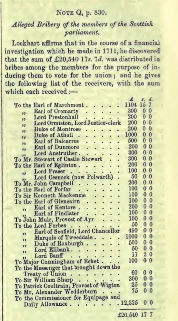 If we’re looking for an explanation of the crushing poverty we Scots have experienced across countless generations, it’s to be found in the theft of our sovereign territorial resources by our neighbour. Its constitutional coup d’etat succeeded in 1707, by threat, intimidation, and the cynical dishonesty we’ve come to associate with ‘Pefidious Albion’. Here’s a list of the bribes given to force an unwanted Union upon our people. If for no other reason, then these bribes alone should render the Union treaty illegitimate. Nul and void.