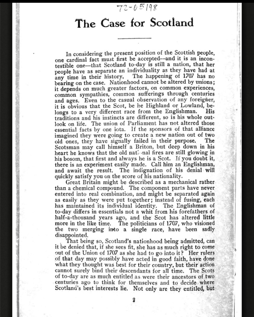 The politicians of 1707, who visioned the two merging into a single race, have been sadly disappointed. That being so, Scotland’s nationhood being admitted, can it be denied that, if she sees fit, she has as much right to come out of the Union of 1707 as she had to go into it?