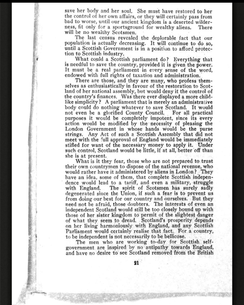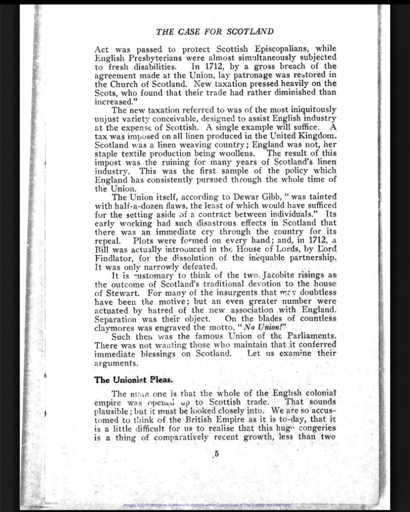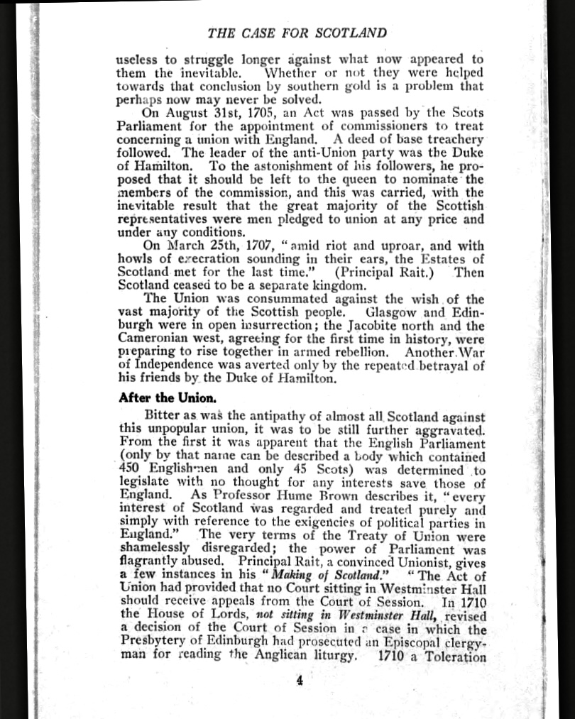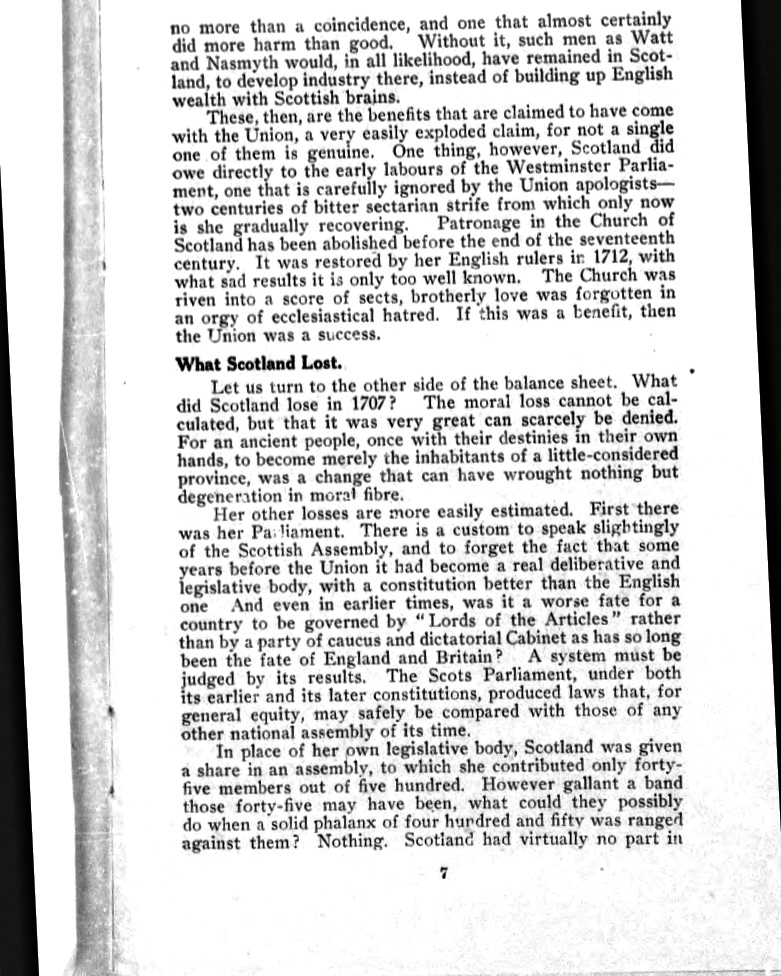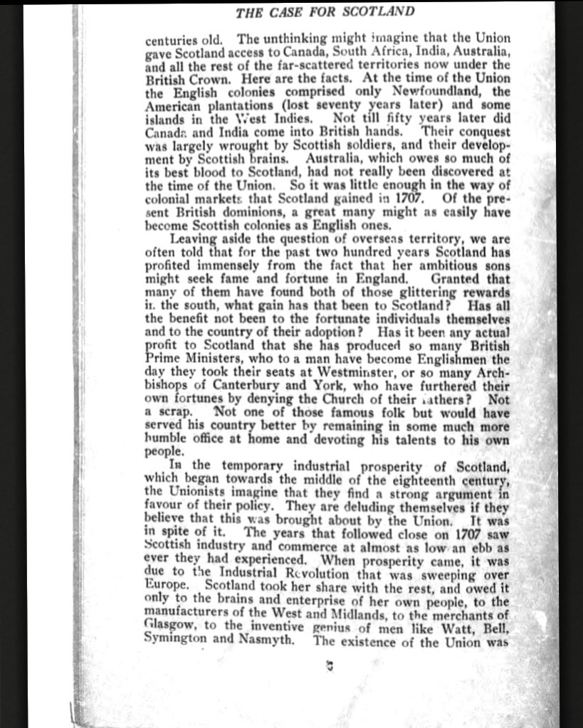 In the temporary industrial prosperity of Scotland, which began towards the middle of the eighteenth century, the Unionists imagine that they find a strong argument in favour of their policy. They are deluding themselves if they believe that this was brought about by the Union. It was in spite of it.