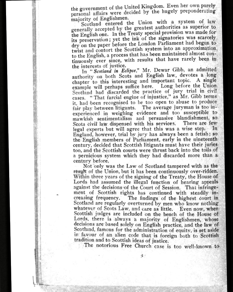 Not only was the Law of Scotland tampered with as the result of the Union, but it has been continuously over-ridden. Within three years of the signing of the Treaty, the House of Lords had assumed the illegal function of hearing appeals against the decisions of the Court of Session. That infringement of Scottish rights has continued with steadily increasing frequency.
