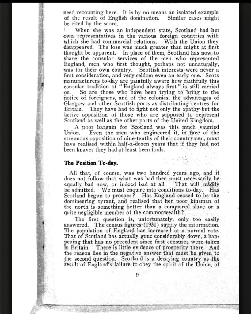That will readily be admitted. We must enquire into conditions today. Has Scotland begun to prosper? Has England ceased to be the domineering tyrant, and realised that her poor kinsman of the north is something better than a conquered slave or a quite negligible member of the commonwealth? The first question is, unfortunately, only too easily answered. The census figures-(1931) supply the information. The population of England has increased at a normal rate. That of Scotland has actually gone considerably down, a happening that has no precedent since first censuses were taken in Britain. There is little evidence of prosperity there. And the reason lies in the negative answer that must be given to the second question.