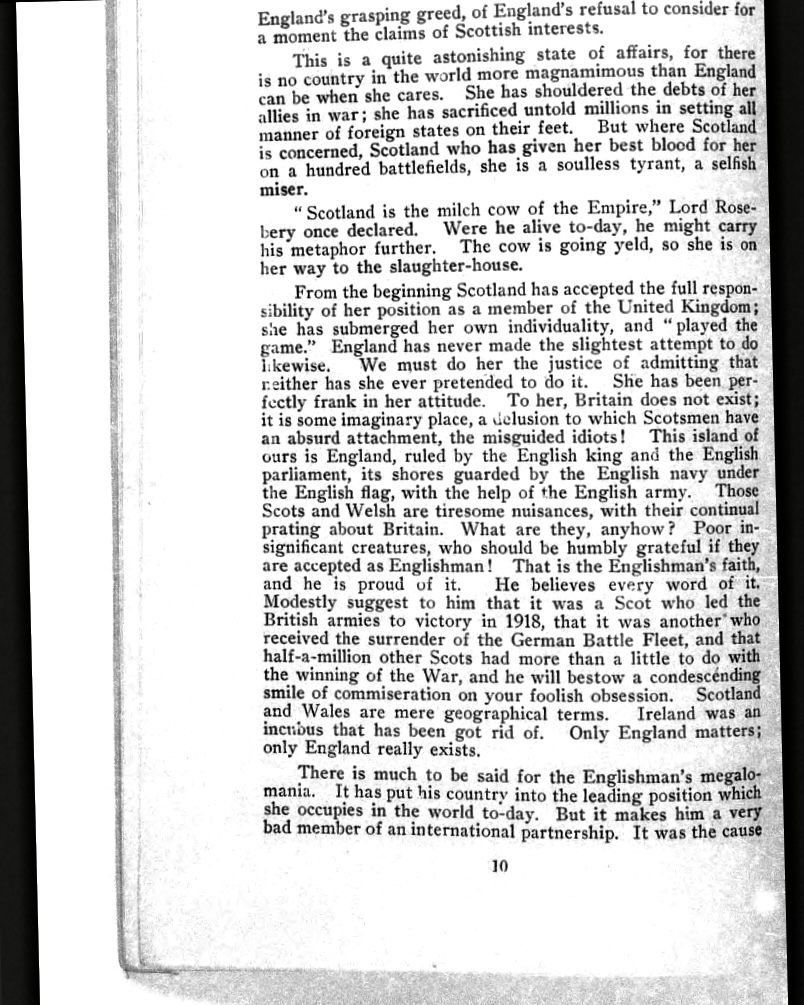 This island of ours is England, ruled by the English king and the English parliament, its shores guarded by the English navy under the English flag, with the help of the English army. Those Scots and Welsh are tiresome nuisances, with their continual prating about Britain. What are they, anyhow? Poor insignificant creatures, who should be humbly grateful if they are accepted as Englishman! That is the Englishman’s faith, and he is proud of it. He believes every word of it. Modestly suggest to him that it was a Scot who led the British armies to victory in 1918, that it was another who received the surrender of the German Battle Fleet, and that half-a-million other Scots had more than a little to do with the winning of the War, and he will bestow a condescending smile of commiseration on your foolish obsession Scotland and Wales are mere geographical terms. Ireland was an incubus that has been got rid of. Only England matters; only England really exists.
