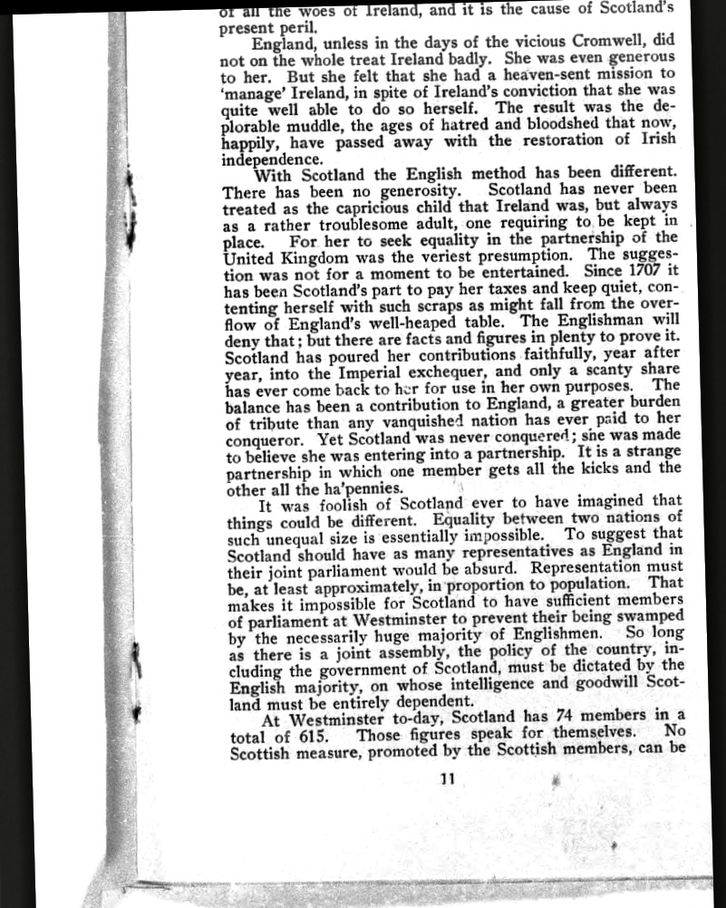 It was foolish of Scotland ever to have imagined that things could be different. Equality between two nations of such unequal size is essentially impossible.. To suggest that Scotland should have as many representatives as England in their joint parliament would be absurd. Representation must be, at least approximately, in proportion to population. That makes it impossible for Scotland to have sufficient members of parliament at Westminster to prevent their being swamped by the necessarily huge majority of Englishmen. So long as there is a joint assembly, the policy of the country, including the government of Scotland, must be dictated by the English majority, on whose intelligence and goodwill Scotland must be entirely dependent.