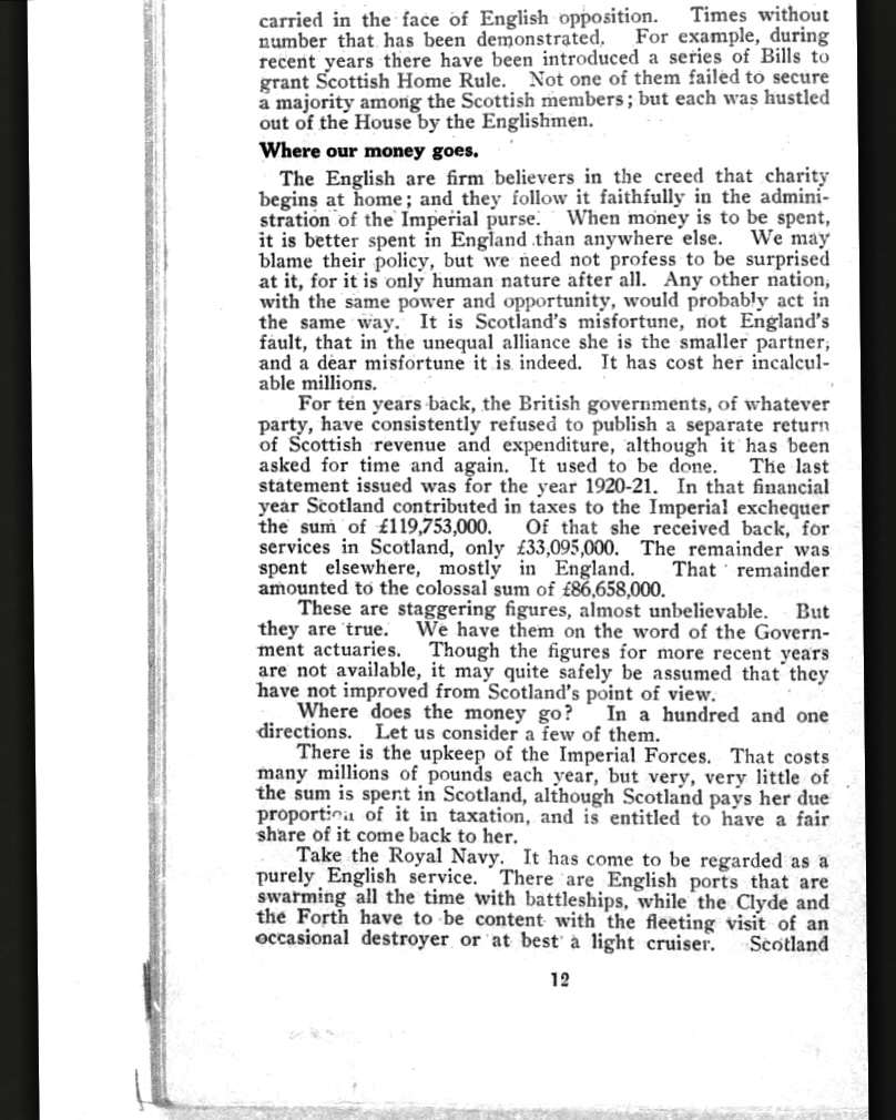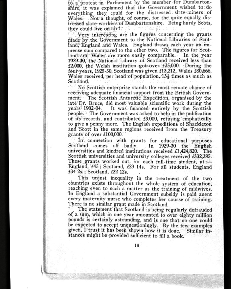 Even worse, perhaps, than the scandal of the Army and Navy is that of the Civil Service, although the sum of money involved may not be so great. The thing called the Scottish Office is situated in London. The staff consists largely of Englishmen, and every penny of their salaries goes into English pockets.