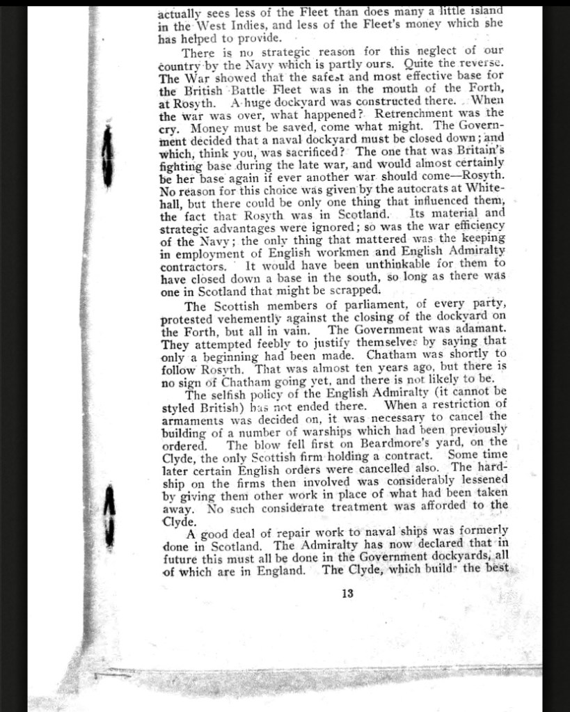 There is no strategic reason for this neglect of our country by the Navy which is partly ours. Quite the reverse. The War showed that the safest and most effective base for the British Battle Fleet was in the mouth of the Forth, at Rosyth. A huge dockyard was constructed there. When the war was over, what happened? Retrenchment was the cry. Money must be saved, come what might. The Government decided that a naval dockyard must be closed down; and which, think you, was sacrificed? The one that was Britain’s fighting base during the late war, and would almost certainly be her base again if ever another war should come — Rosyth.