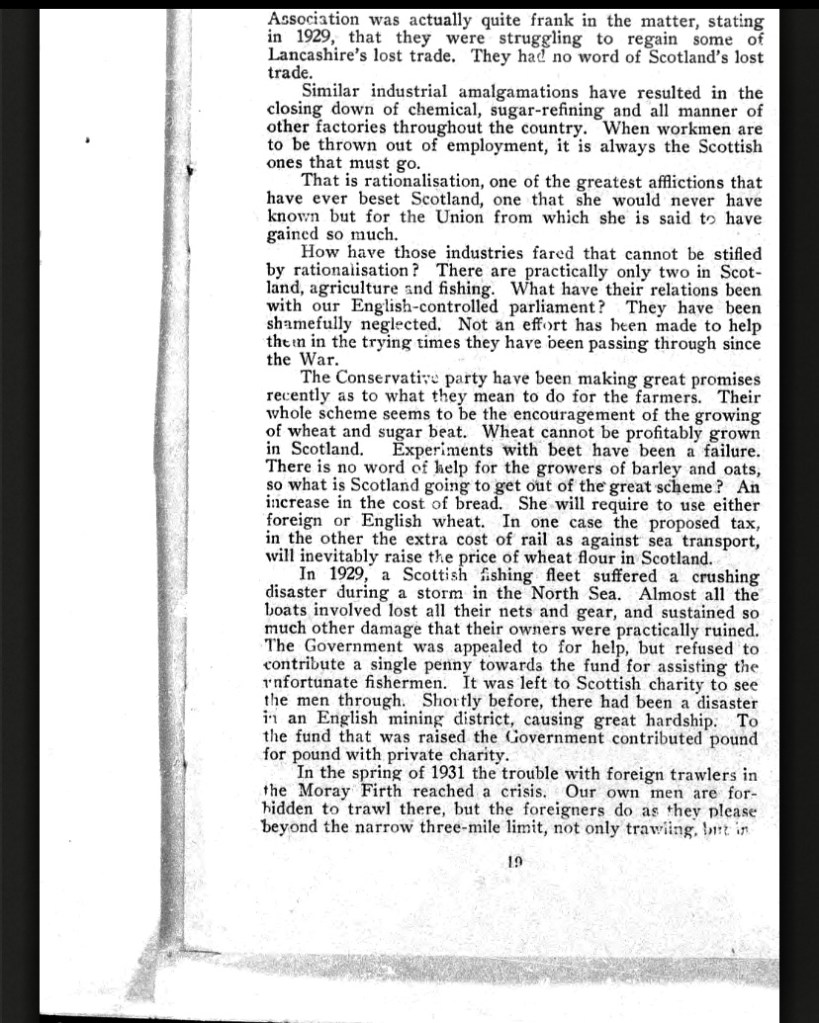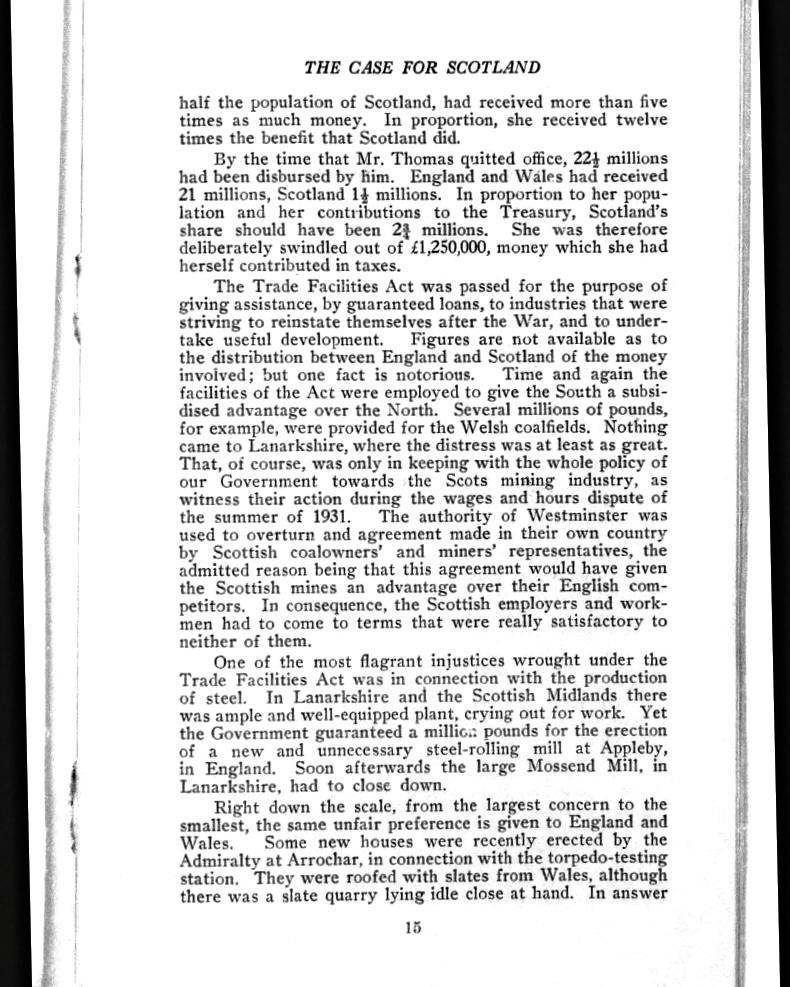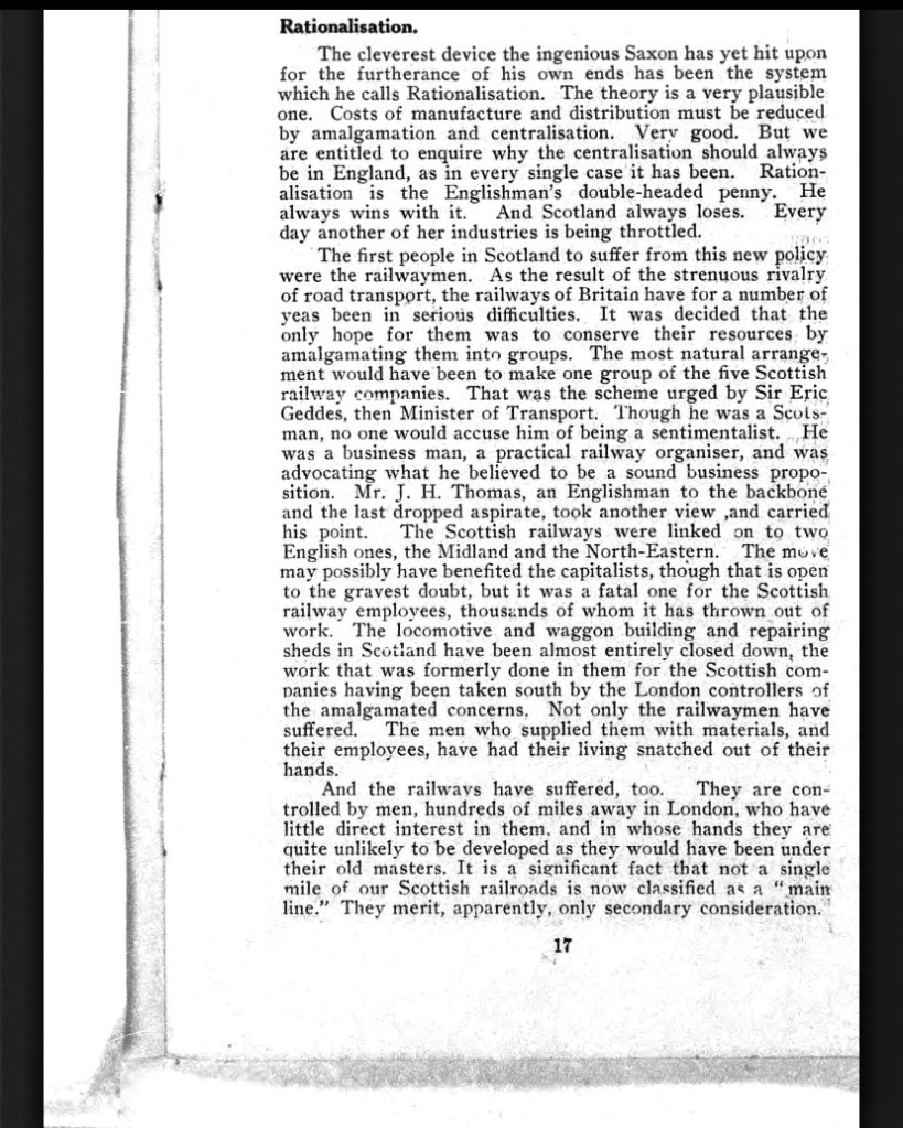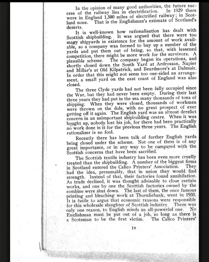 It is futile to argue that economic reasons were responsible for this wholesale slaughter of Scottish industry. There was only one reason, to English minds, an all-powerful one. No Englishman must be put out of a job, so long as there is Scotsman to be the first victim.