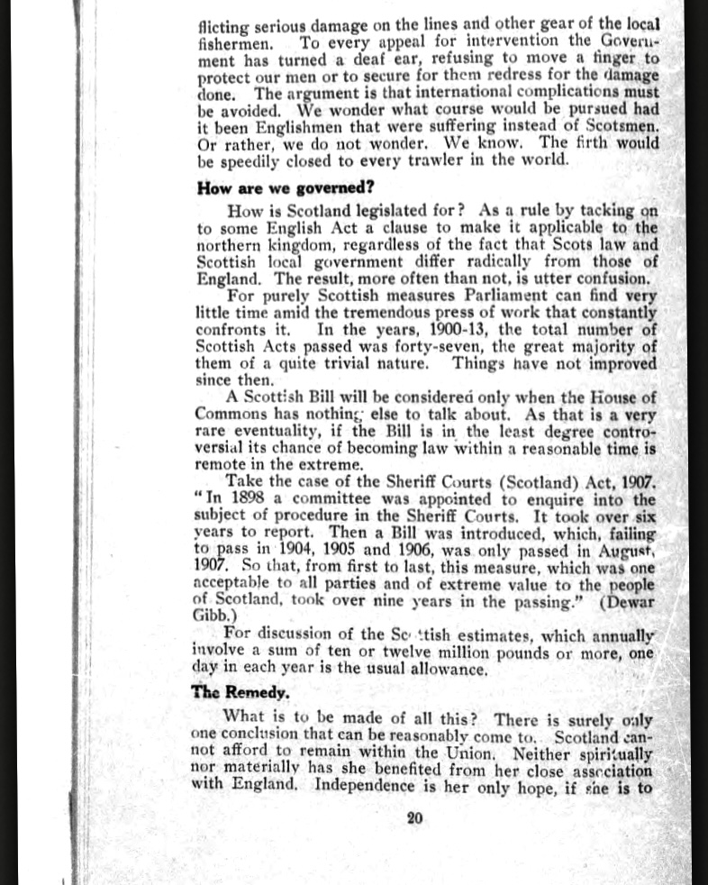 There are those, and they are many, who profess themselves as enthusiastically in favour of the restoration to Scotland, of her national assembly, but would deny it the control of the country’s finances. Was there ever displayed a more childlike simplicity? A parliament that is merely an administrative body could do nothing whatever to save Scotland. It would not even be a glorified County Council. For all practical purposes, it would be completely impotent, since its every action would be modified by the necessity of pleasing the London Government, in whose hands would be the purse strings. Any Act, of such a Scottish Assembly, that did not meet with the full approval of England would be immediately stifled, for want of the necessary money to apply it.
