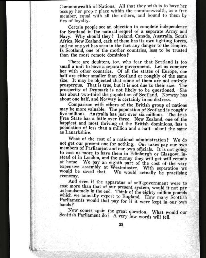 Certain people see an objection to complete independence for Scotland, in the natural sequel of a separate Army and Navy. Why should they? Ireland, Canada, Australia, South Africa, New Zealand, each of them has its own fighting forces, and no one yet has seen in the fact, any danger to the Empire. Is Scotland, one of the mother countries, less to be trusted than the most remote dominion?