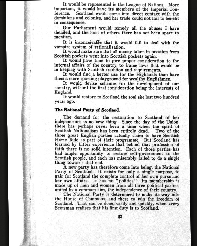 A new party has therefore come into being, the National Party of Scotland. It exists for only a single purpose, to gain for Scotland the complete control of her own purse, and her own affairs. It has no “politics.” Its membership is made up of men and women from all three political parties, united by a common aim, the independence of their country.