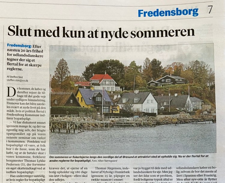 The headline that caught my eye was: “Fishing village now off-limits for Danes based abroad” (Fiskerlejer bliver lukket land for udlandsdanskere). Turns out, the classy properties in the little fishing village just east of here, can now only be bought by Danes abroad if the houses are occupied 180 days per year.