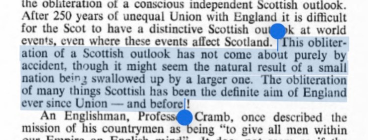 “This obliteration of a Scottish outlook has not come about purely by accident, though it might seem the natural result of a small nation being swallowed up by a larger one. The obliteration of many things Scottish has been the definite aim of England ever since Union, and before!”